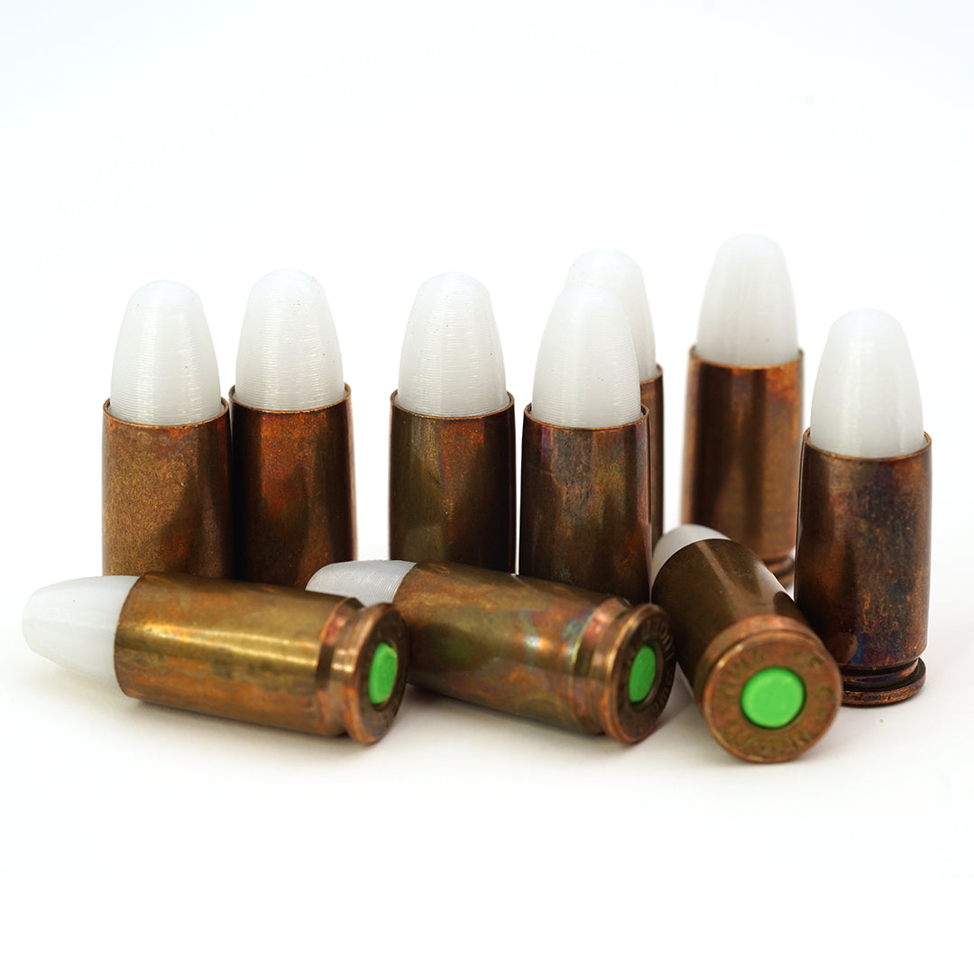 Malfunctions don’t just happen in the daytime — train in the environments you work in. Our 9mm dummy rounds feature a glow-in-the-dark plastic tip, paired with a durable brass case for reliable feeding and long service life. Perfect for dry-fire practice, malfunction drills, and weapons-handling training, these inert snap caps give you confidence whether training indoors or in low light.